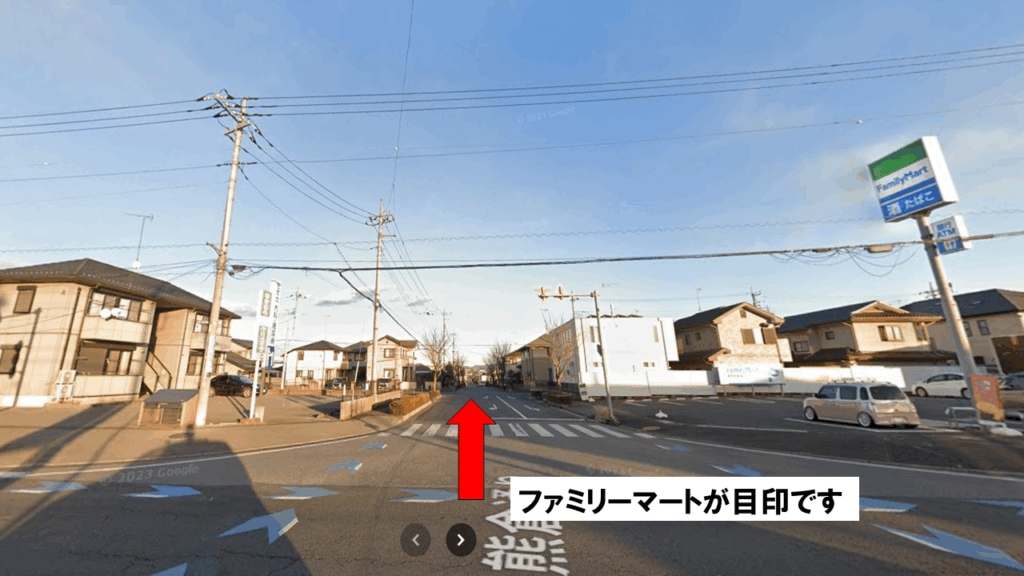 ① 高間木通りにあるTSUTAYAとファミリーマートのT字路を東に入ります